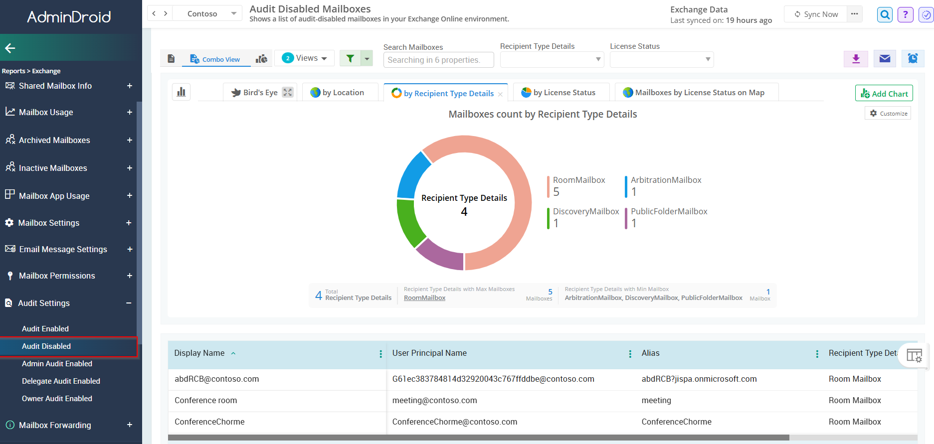 - This report helps to identify non-audited mailboxes by recipient type, location, license status, and more, to ensure no mailbox is overlooked.