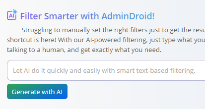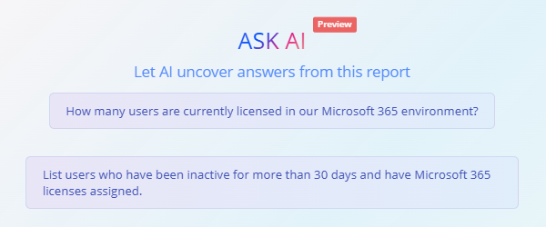Generate custom reports instantly with our built-in AI assistant. Whether you're looking for user activity, license usage, security insights, or specific audit details, the AI assistant helps you get the information you need faster and with less manual effort. Just click on âAsk AIâ from any report to get started!