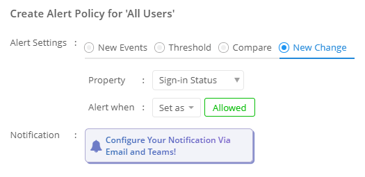Receive alerts when specific property values change, such as user details, MFA status, system states, license configurations, and more. Get notified instantly via Email or Teams and act before making an impact.